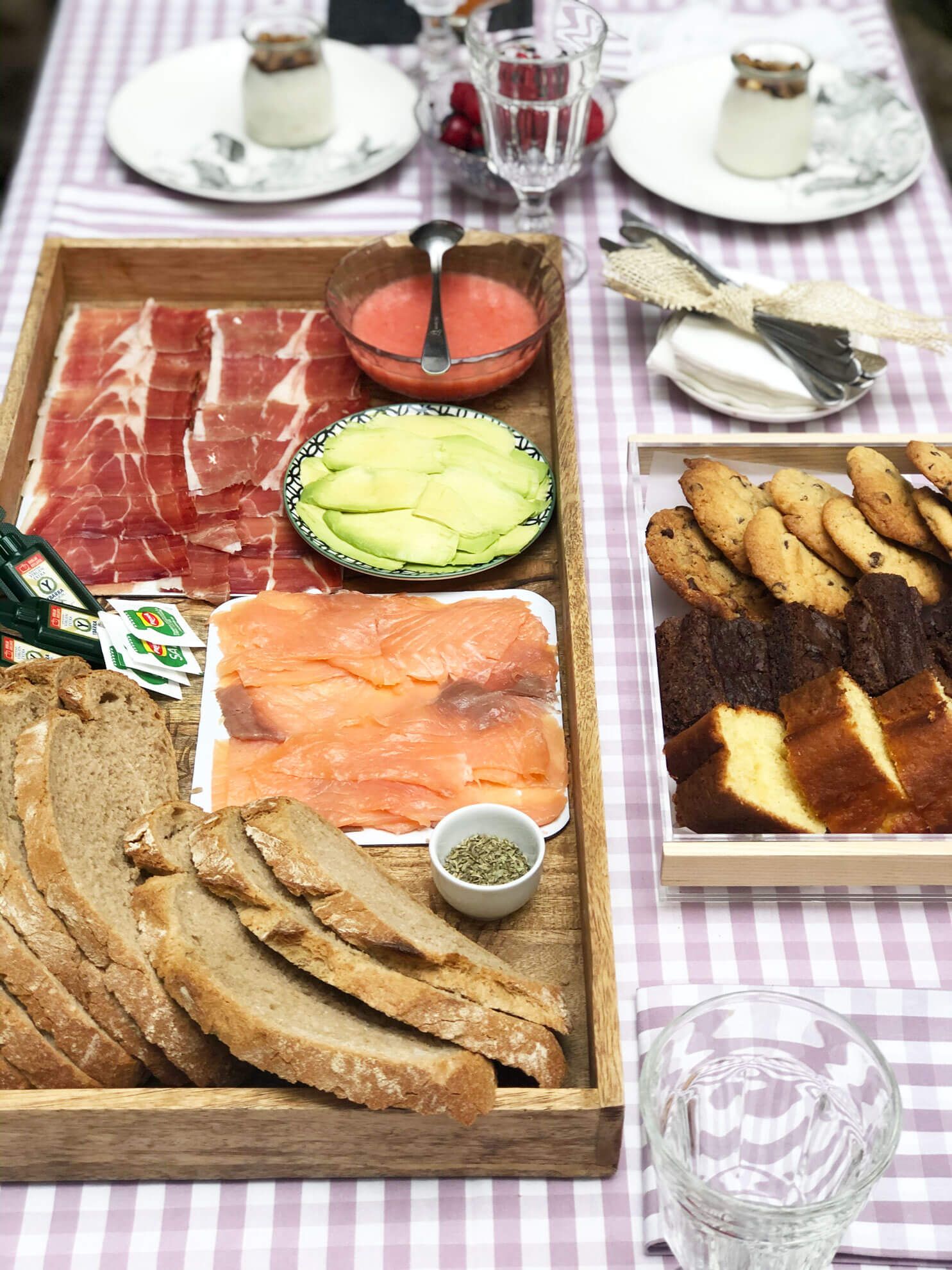 BRUNCH (2 personas): Café, té o ColaCao | Zumo natural de naranja o pomelo | Bizcocho, brownie, cookies | Bol de yogur con granola | Fruta | Hogaza de pan Salmón ahumado | Jamón y tomate | Aguacate | Mermelada